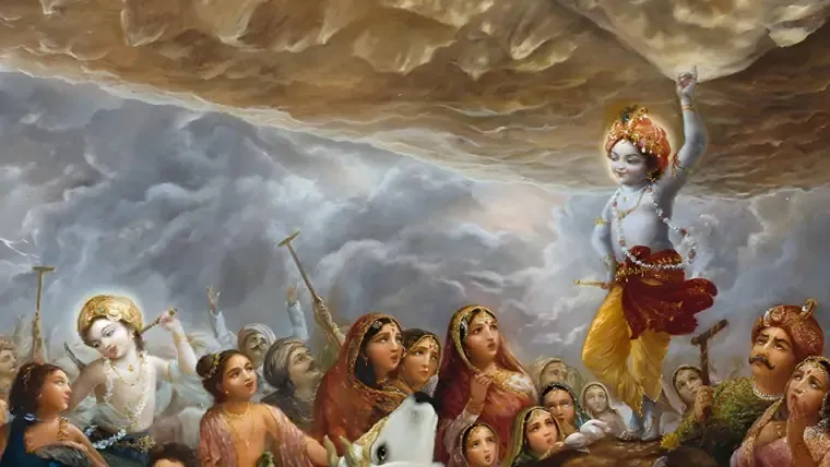 According to Hindu mythology, the inhabitants of Gokul celebrated a festival in honor of Lord Indra at the end of each monsoon. However, one year, Lord Krishna persuaded the villagers to stop worshipping Indra and instead honor the Govardhan hill, which provided their resources. Indra, angered by this change, unleashed heavy rains upon the village. To protect the villagers and their cattle, Krishna lifted the Govardhan hill with his little finger, providing them shelter for six days. Indra soon realized his mistake and sought forgiveness from Krishna.